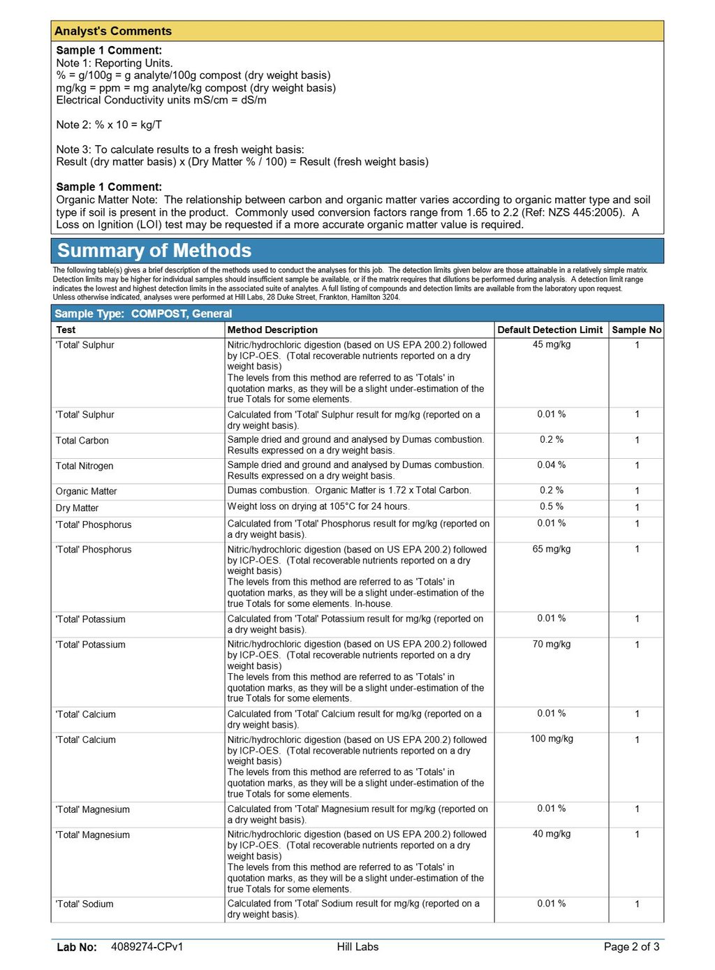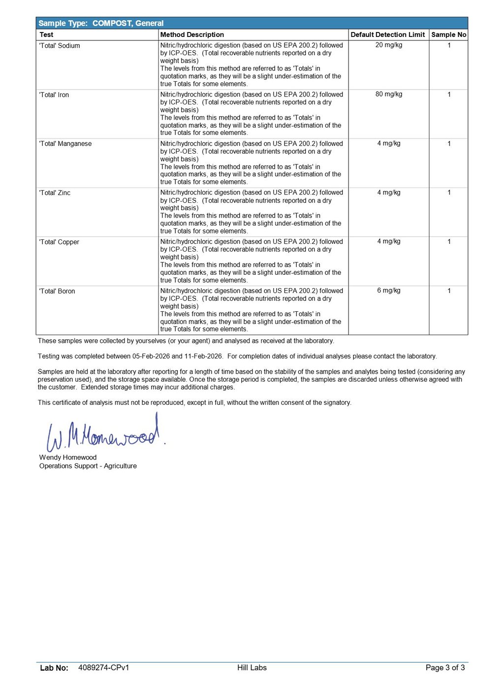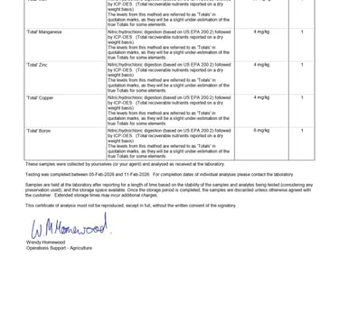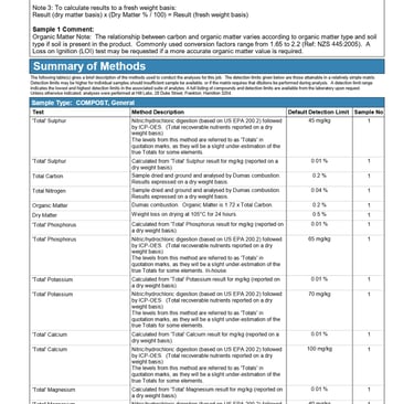 0.93% magnesium, 0.24% sulphur, and 0.14% calcium. Trace elements such as iron, manganese, zinc, and copper are present within accepted compost guideline limits (NZS 4454:2005 and BioGro 2009 standards).