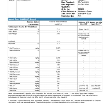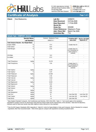 Independent laboratory testing by Hill Laboratories (NZ) confirms that our Mealworm Frass is a nutrient-rich organic soil amendment with strong biological and mineral value.