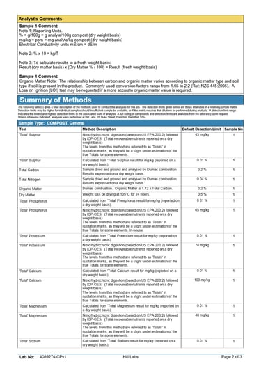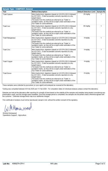 0.93% magnesium, 0.24% sulphur, and 0.14% calcium. Trace elements such as iron, manganese, zinc, and copper are present within accepted compost guideline limits (NZS 4454:2005 & BioGro 2009 standards).